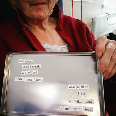 I introduced myself to Mrs J and explained who I was and asked if she would be interested in seeing some of my typewriter work, deciding to go slow and not overwhelm her because she looked exhausted. She smiled warmly at me and her eyes reassured me that I was no intrusion, so I showed her some of my typewriter images and this made her smile a lot, and I explained how I use text and language in my work- as an opener to allow me to introduce some kind of a text-based activity.